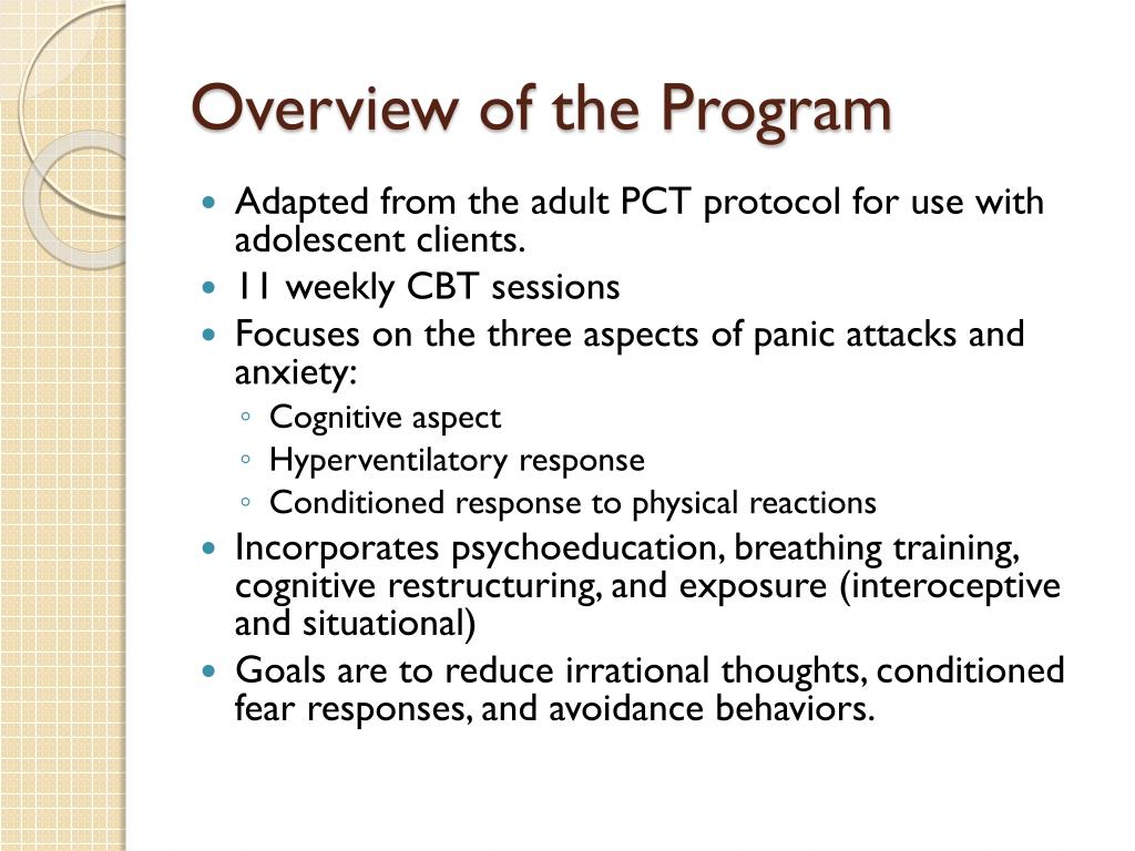 Overview of the Program • Adapted from the adult PCT protocol for use with adolescent clients. • 11 weekly CBT sessions • Focuses on the three aspects of panic attacks and anxiety: • Cognitive aspect • Hyperventilatory response • Conditioned response to physical reactions • Incorporates psychoeducation, breathing training, cognitive restructuring, and exposure (interoceptive and situational) • Goals are to reduce irrational thoughts, conditioned fear responses, and avoidance behaviors.