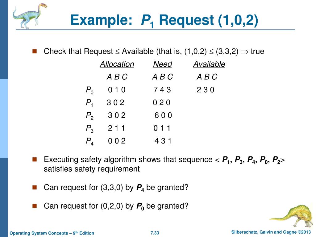 Resource-Request Algorithm for Process Pi Requesti = request vector for process Pi. If Requesti[j] = kthen process Pi wants k instances of resource type Rj 1. If Requesti Needigo to step 2. Otherwise, raise error condition, since process has exceeded its maximum claim 2. If Requesti Available, go to step 3. Otherwise Pi must wait, since resources are not available 3. Pretend to allocate requested resources to Pi by modifying the state as follows: Available = Available – Requesti; Allocationi= Allocationi + Requesti; Needi= Needi – Requesti; • If safe the resources are allocated to Pi • If unsafe Pi must wait, and the old resource-allocation state is restored