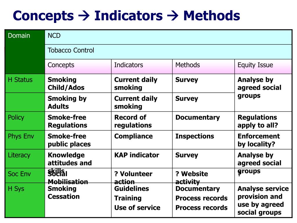 Concepts Indicators Methods Domain NCD Tobacco Control Concepts Indicators Methods Equity Issue H Status Smoking Child/Ados Current daily smoking Survey Analyse by agreed social groups Smoking by Adults Current daily smoking Survey Policy Smoke-free Regulations Record of regulations Documentary Regulations apply to all? Phys Env Smoke-free public places Compliance Inspections Enforcement by locality? Literacy Knowledge attitudes and skills KAP indicator Survey Analyse by agreed social groups Soc Env Social Mobilisation ? Volunteer action ? Website activity ? H Sys Smoking Cessation Guidelines Training Use of service Documentary Process records Process records Analyse service provision and use by agreed social groups