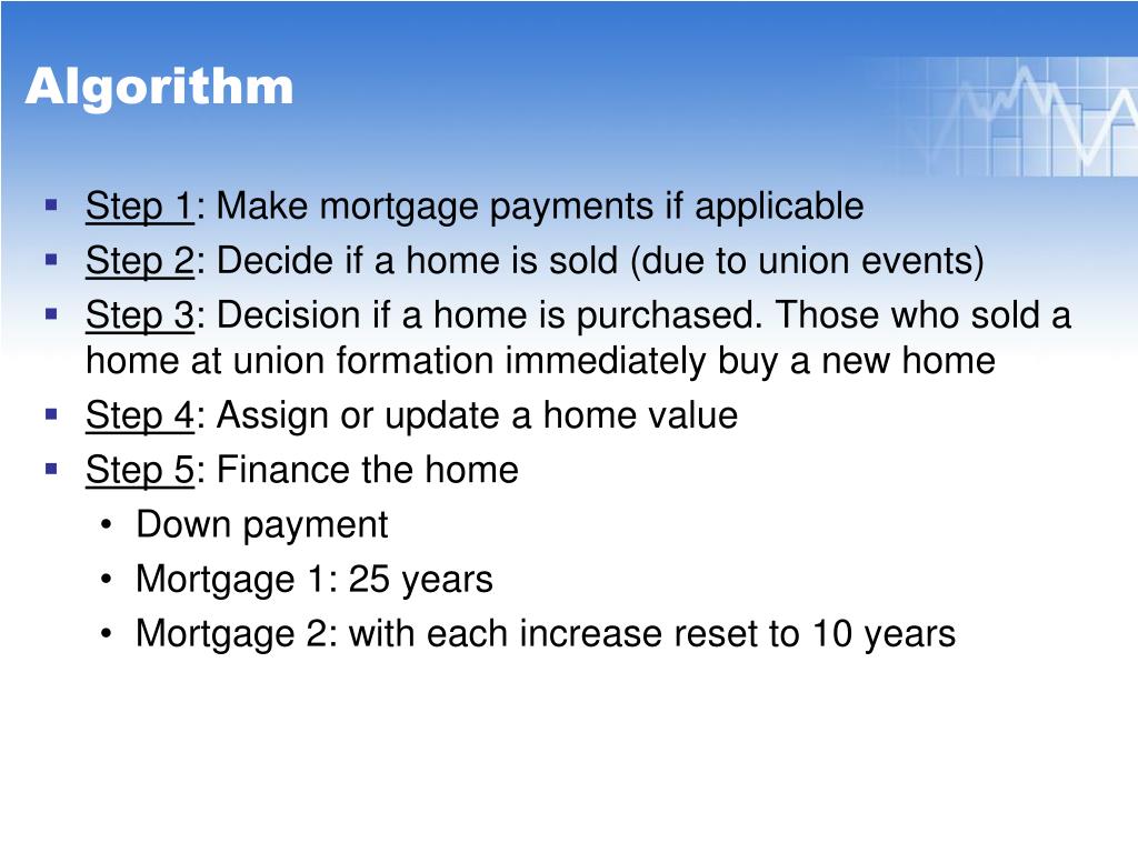 Step 1: Make mortgage payments if applicable Step 2: Decide if a home is sold (due to union events) Step 3: Decision if a home is purchased. Those who sold a home at union formation immediately buy a new home Step 4: Assign or update a home value Step 5: Finance the home Down payment Mortgage 1: 25 years Mortgage 2: with each increase reset to 10 years Algorithm