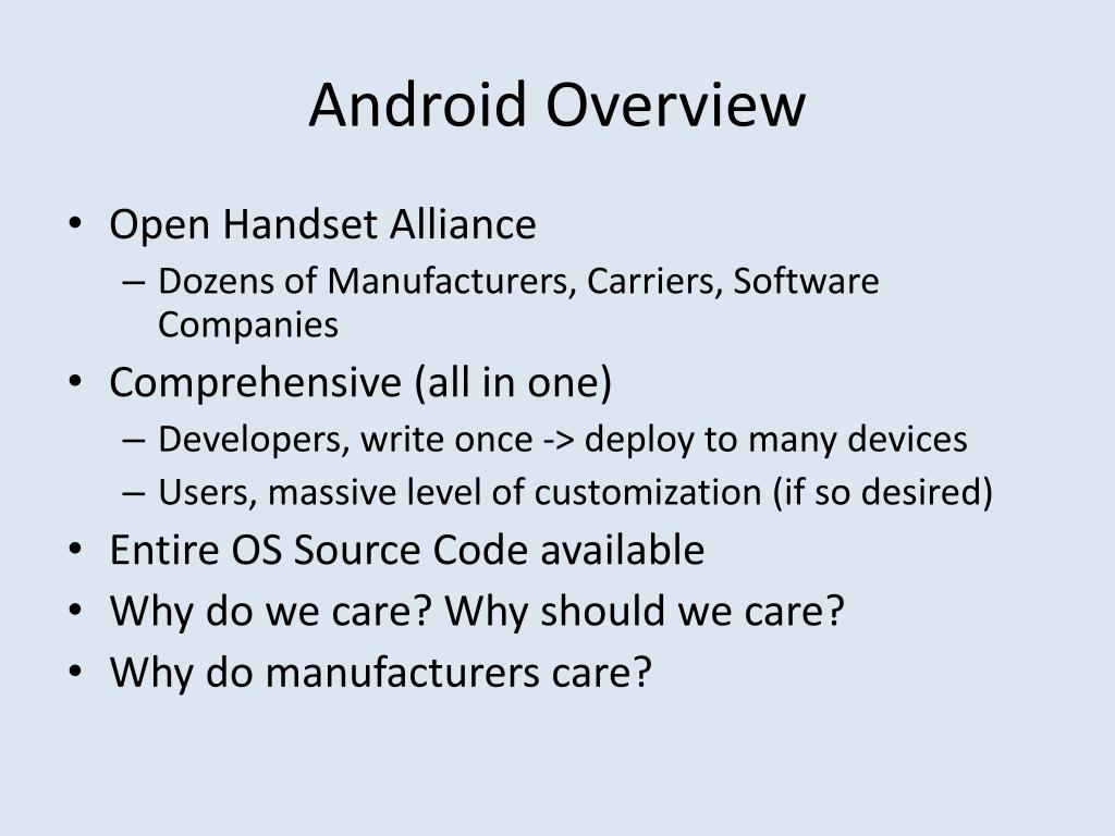 Android Overview • Open Handset Alliance • Dozens of Manufacturers, Carriers, Software Companies • Comprehensive (all in one) • Developers, write once -> deploy to many devices • Users, massive level of customization (if so desired) • Entire OS Source Code available • Why do we care? Why should we care? • Why do manufacturers care?