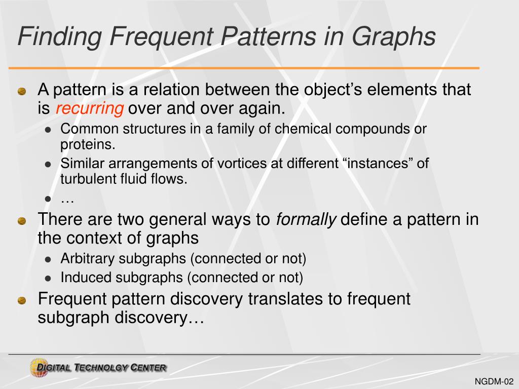 Finding Frequent Patterns in Graphs • A pattern is a relation between the object’s elements that is recurringover and over again. • Common structures in a family of chemical compounds or proteins. • Similar arrangements of vortices at different “instances” of turbulent fluid flows. • … • There are two general ways to formally define a pattern in the context of graphs • Arbitrary subgraphs (connected or not) • Induced subgraphs (connected or not) • Frequent pattern discovery translates to frequent subgraph discovery… NGDM-02