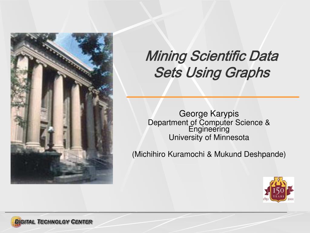 Mining Scientific Data Sets Using Graphs. George Karypis Department of Computer Science & Engineering University of Minnesota (Michihiro Kuramochi & Mukund Deshpande). Outline. Mining Scientific Data-sets Opportunities & Challenges Using Graphs and Mining them Pattern Discovery in Graphs