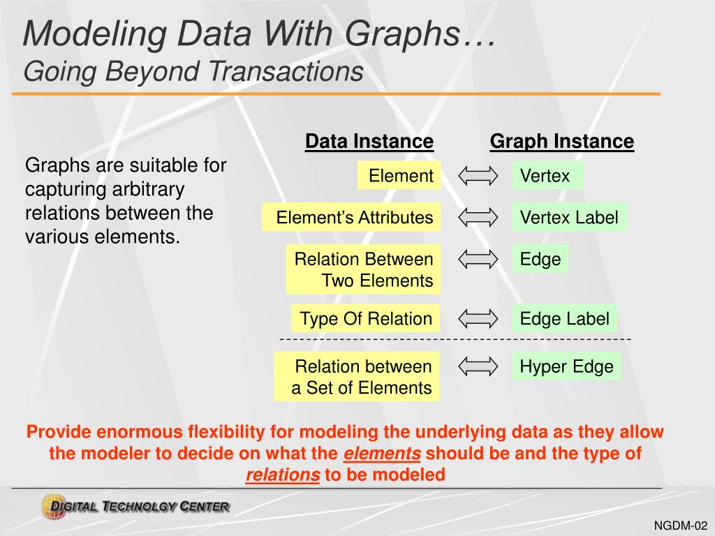 Modeling Data With Graphs…Going Beyond Transactions Graphs are suitable for capturing arbitrary relations between the various elements. Data Instance Graph Instance Element Vertex Element’s Attributes Vertex Label Relation Between Two Elements Edge Type Of Relation Edge Label Relation between a Set of Elements Hyper Edge Provide enormous flexibility for modeling the underlying data as they allow the modeler to decide on what the elementsshould be and the type of relationsto be modeled NGDM-02