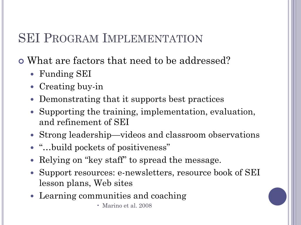 SEI Program Implementation • What are factors that need to be addressed? • Funding SEI • Creating buy-in • Demonstrating that it supports best practices • Supporting the training, implementation, evaluation, and refinement of SEI • Strong leadership—videos and classroom observations • “…build pockets of positiveness” • Relying on “key staff” to spread the message. • Support resources: e-newsletters, resource book of SEI lesson plans, Web sites • Learning communities and coaching • Marino et al. 2008