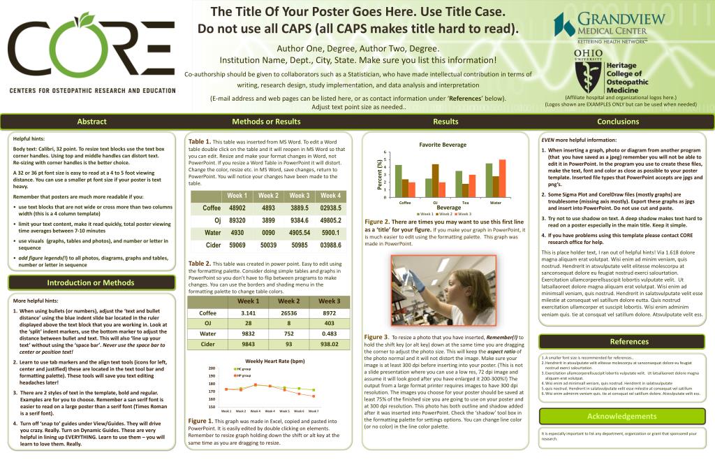 The Title Of Your Poster Goes Here. Use Title Case.Do not use all CAPS (all CAPS makes title hard to read). Author One, Degree, Author Two, Degree.Institution Name, Dept., City, State. Make sure you list this information! Co-authorship should be given to collaborators such as a Statistician, who have made intellectual contribution in terms of writing, research design, study implementation, and data analysis and interpretation (E-mail address and web pages can be listed here, or as contact information under ‘References’ below). Adjust text point size as needed.. (Affiliate hospital and organizational logos here.) (Logos shown are EXAMPLES ONLY but can be used when needed) Abstract Methods or Results Results Conclusions • Helpful hints: • Body text: Calibri, 32 point. To resize text blocks use the text box corner handles. Using top and middle handles can distort text.Re-sizing with corner handles is the better choice. • A 32 or 36 pt font size is easy to read at a 4 to 5 foot viewing distance. You can use a smaller pt font size if your poster is text heavy. • Remember that posters are much more readable if you: • use text blocks that are not wide or cross more than two columns width (this is a 4 column template) • limit your text content, make it read quickly, total poster viewing time averages between 7-10 minutes • use visuals (graphs, tables and photos), and number or letter in sequence • add figure legends(!) to all photos, diagrams, graphs and tables, number or letter in sequence Table 1. This table was inserted from MS Word. To edit a Word table double click on the table and it will reopen in MS Word so that you can edit. Resize and make your format changes in Word, not PowerPoint. If you resize a Word Table in PowerPoint it will distort. Change the color, resize etc. in MS Word, save changes, return to PowerPoint. You will notice your changes have been made to the table. EVEN more helpful information: When inserting a graph, photo or diagram from another program (that you have saved as a jpeg) remember you will not be able to edit it in PowerPoint. In the program you use to create these files, make the text, font and color as close as possible to your poster template. Inserted file types that PowerPoint accepts are jpgs and png’s. Some Sigma Plot and CorelDraw files (mostly graphs) are troublesome (missing axis mostly). Export these graphs as jpgs and insert into PowerPoint. Do not use cut and paste. Try not to use shadow on text. A deep shadow makes text hard to read on a poster especially in the main title. Keep it simple. If you have problems using this template please contact CORE research office for help. This is place holder text, I ran out of helpful hints! Via 1.618 dolore magna aliquam erat volutpat. Wisi enim ad minim veniam, quis nostrud. Hendrerit in atsvulputate velit elitesse molescorpu at sanconsequat dolore eu feugiat nostrud exerci salourtation. Exercitation ullamcorperellsuscipit lobortis vulputate velit. Ut latsallaoreet dolore magna aliquam erat volutpat. Wisi enim ad minimsall veniam, quis nostrud. Hendrerit in salatsvulputate velit esse milestie at consequat vel satillum dolore eutta. Quis nostrud exercitation ullamcorper et suscipit lobortis. Wisi enim adminim veniam quis. tie at consquat vel satillum dolore. Atsvulputate velit ess. Figure 2. There are times you may want to use this first line as a ‘title’ for your figure. If you make your graph in PowerPoint, it is much easier to edit using the formatting palette. This graph was made in PowerPoint. Table 2. This table was created in power point. Easy to edit using the formatting palette. Consider doing simple tables and graphs in PowerPoint so you don’t have to flip between programs to make changes. You can use the borders and shading menu in the formatting palette to change table colors. Introduction or Methods More helpful hints: When using bullets (or numbers), adjust the ‘text and bullet distance’ using the blue indent slide bar located in the ruler displayed above the text block that you are working in. Look at the ‘split’ indent markers, use the bottom marker to adjust the distance between bullet and text. This will also ‘line up your text’ without using the ‘space bar’. Never use the space bar to center or position text! Learn to use tab markers and the align text tools (icons for left, center and justified) these are located in the text tool bar and formatting palette). These tools will save you text editing headaches later! There are 2 styles of text in the template, bold and regular. Examples are for you to choose. Remember a san serif font is easier to read on a large poster than a serif font (Times Roman is a serif font). Turn off ‘snap to’ guides under View/Guides. They will drive you crazy. Really. Turn on Dynamic Guides. These are very helpful in lining up EVERYTHING. Learn to use them – you will learn to love them. Really. Figure 3. To resize a photo that you have inserted, Remember(!)to hold the shift key (or alt key) down at the same time you are dragging the corner to adjust the photo size. This will keep the aspect ratioof the photo normal and it will not distort the image. Make sure your image is at least 300 dpi before inserting into your poster. (This is not a slide presentation where you can use a low res, 72 dpi image and assume it will look good after you have enlarged it 200-300%!) The output from a large format printer requires images to have 300 dpi resolution. The images you choose for your poster should be saved at least 75% of the finished size you are going to use on your poster and at 300 dpi resolution. This photo has both outline and shadow added after it was inserted into PowerPoint. Check the ‘shadow’ tool box in the formatting palette for settings options. You can change line color (or no color) in the line color palette. References A smaller font size is recommended for references.. Hendrerit in atsvulputate velit el