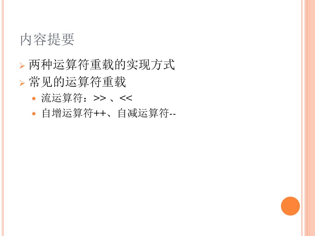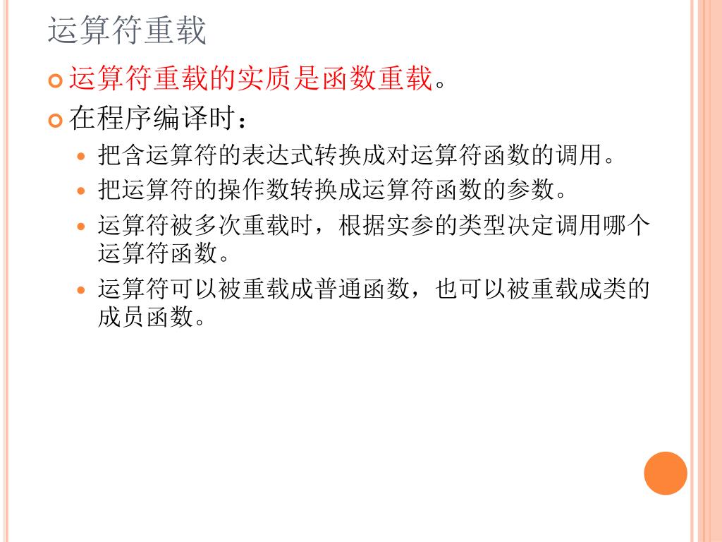 有可能按以下方式重载: • void operator<<(ostream & o,intn){ • Output( n); • } • 假定 Output 是一个能将整数n输出到屏幕上的函数,至于其内部怎么实现,不必深究。 • void operator<<( ostream & o,constchar * s){ • Output(s); • }