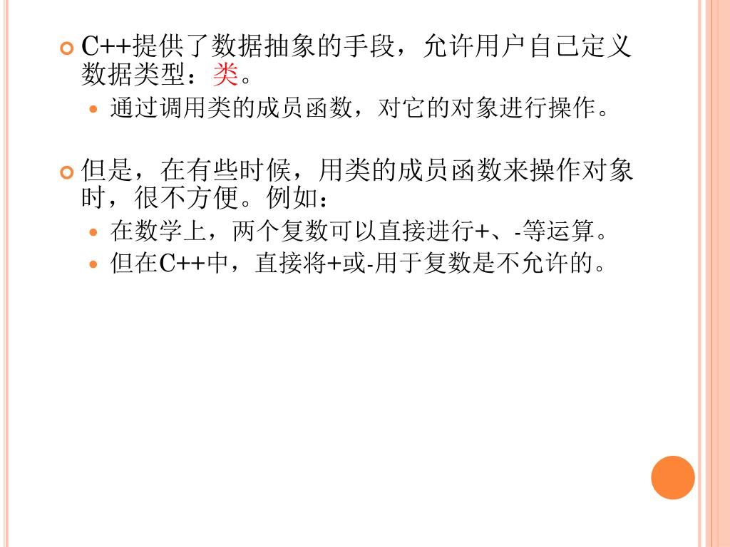 C++提供了数据抽象的手段,允许用户自己定义数据类型:类。C++提供了数据抽象的手段,允许用户自己定义数据类型:类。 • 通过调用类的成员函数,对它的对象进行操作。 • 但是,在有些时候,用类的成员函数来操作对象时,很不方便。例如: • 在数学上,两个复数可以直接进行+、-等运算。 • 但在C++中,直接将+或-用于复数是不允许的。