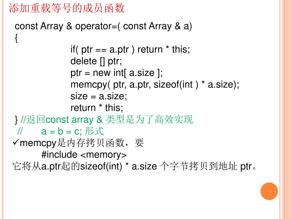 添加重载等号的成员函数 • const Array & operator=( const Array & a) • { • if( ptr == a.ptr ) return * this; • delete [] ptr; • ptr = new int[ a.size ]; • memcpy( ptr, a.ptr, sizeof(int ) * a.size); • size = a.size; • return * this; • } //返回const array & 类型是为了高效实现 • //a = b = c; 形式 • memcpy是内存拷贝函数,要 • #include <memory> • 它将从a.ptr起的sizeof(int) * a.size个字节拷贝到地址 ptr。