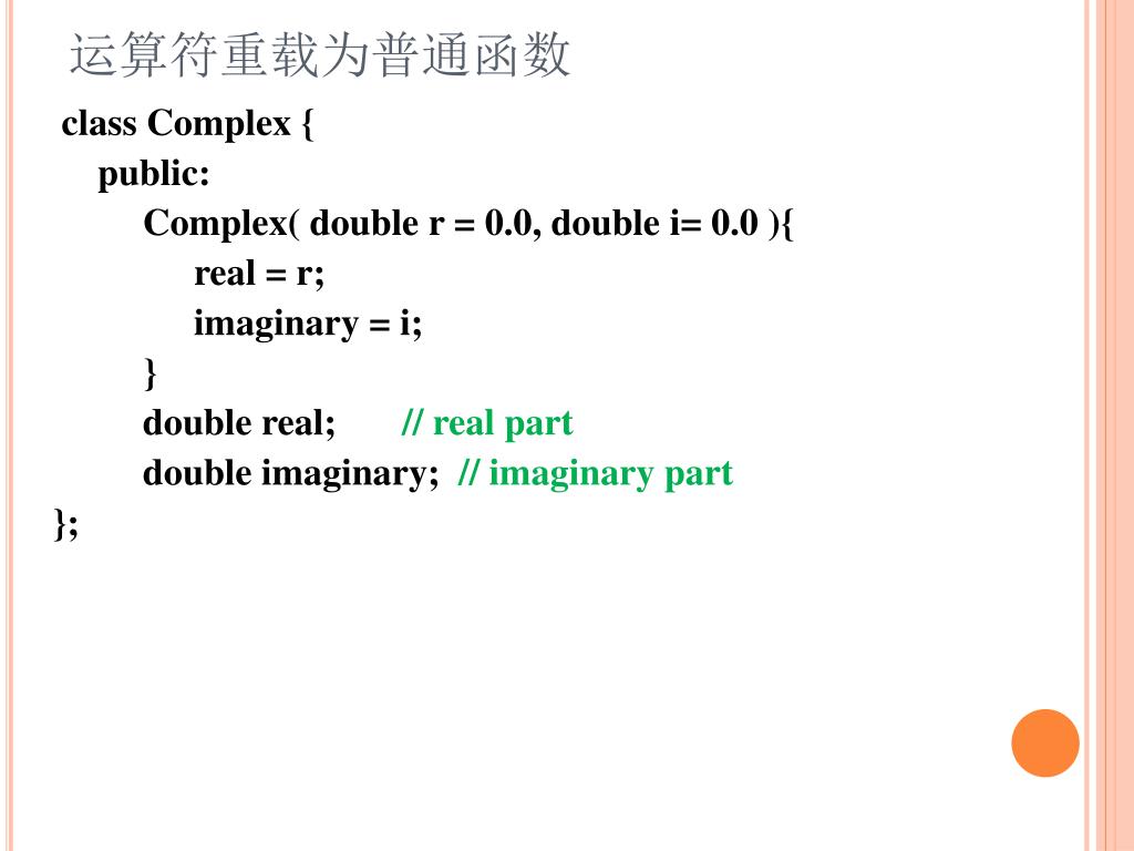 运算符重载为普通函数 class Complex { public: Complex( double r = 0.0, double i= 0.0 ){ real = r; imaginary = i; } double real; // real part double imaginary; // imaginary part };