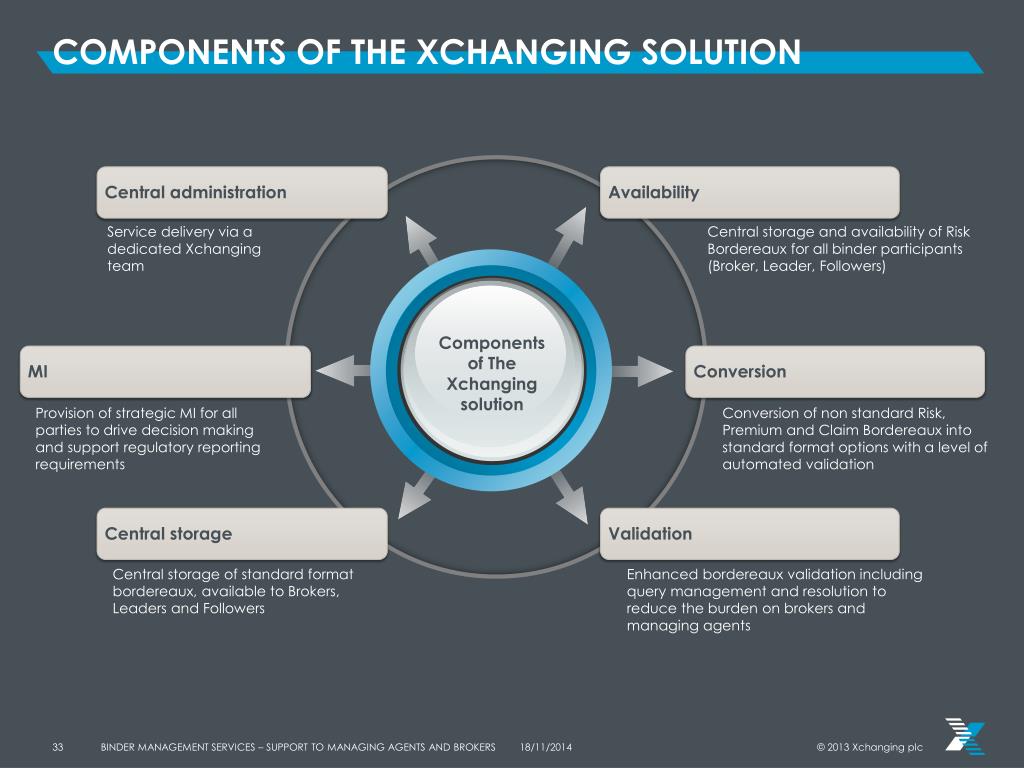 Components of The Xchanging solution Central administration Availability Service delivery via a dedicated Xchanging team Central storage and availability of Risk Bordereaux for all binder participants (Broker, Leader, Followers) Components of The Xchanging solution MI Conversion Provision of strategic MI for all parties to drive decision making and support regulatory reporting requirements Conversion of non standard Risk, Premium and Claim Bordereaux into standard format options with a level of automated validation Central storage Validation Central storage of standard format bordereaux, available to Brokers, Leaders and Followers Enhanced bordereaux validation including query management and resolution to reduce the burden on brokers and managing agents BINDER MANAGEMENT SERVICES – SUPPORT TO MANAGING AGENTS AND BROKERS