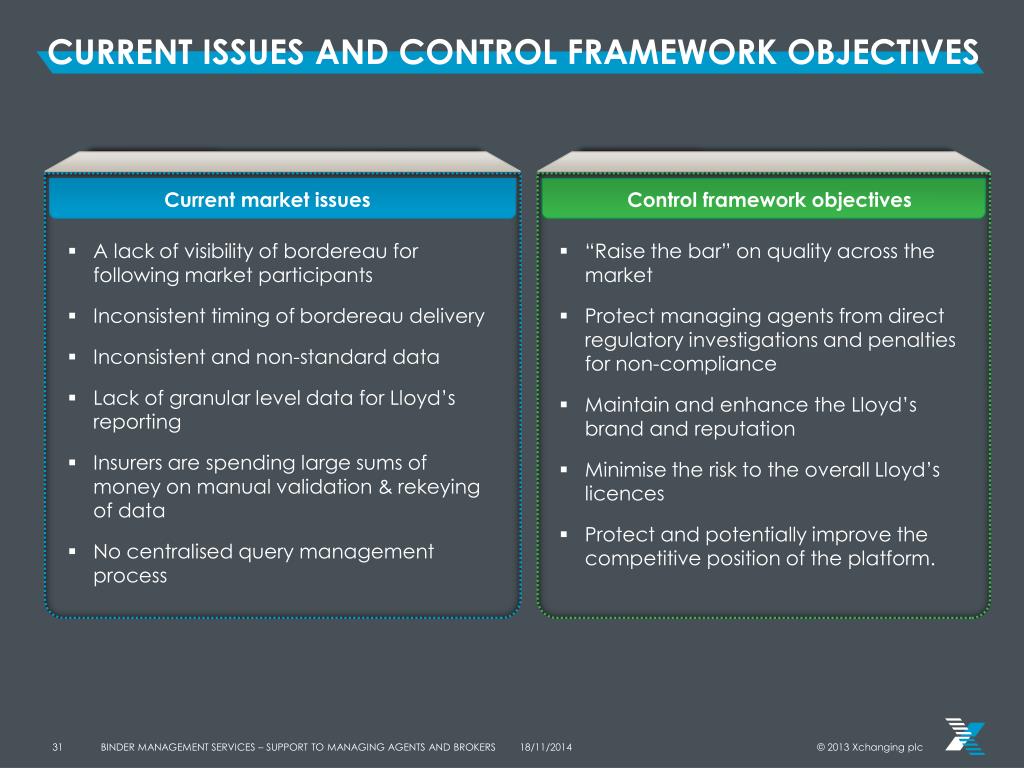 Agenda for today 1 Binders in context Context Current issues and Control Framework objectives Current high level process flow 2 Solution components The Xchanging Solution Elective offerings Revised Process Map 3 Benefits 4 Roadmap and Timeline BINDER MANAGEMENT SERVICES – SUPPORT TO MANAGING AGENTS AND BROKERS