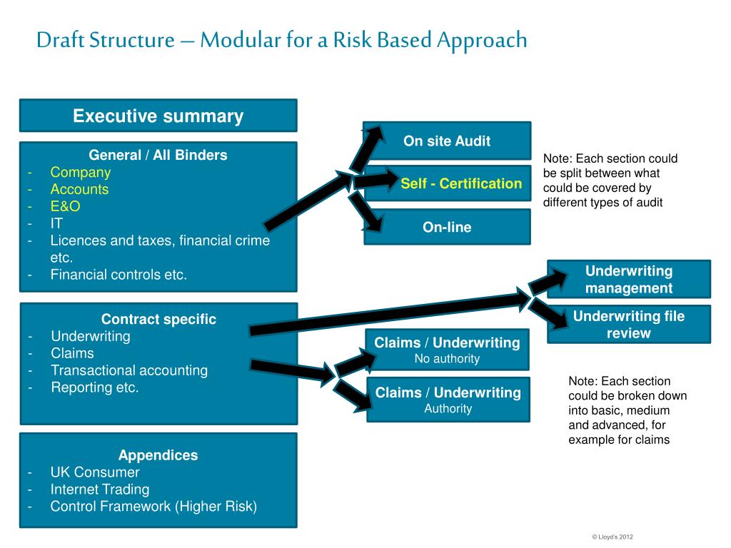 Draft Structure – Modular for a Risk Based Approach Executive summary On site Audit • General / All Binders • Company • Accounts • E&O • IT • Licences and taxes, financial crime etc. • Financial controls etc. Note: Each section could be split between what could be covered by different types of audit Self - Certification On-line Underwriting management • Contract specific • Underwriting • Claims • Transactional accounting • Reporting etc. Underwriting file review Claims / Underwriting No authority Note: Each section could be broken down into basic, medium and advanced, for example for claims Claims / Underwriting Authority • Appendices • UK Consumer • Internet Trading • Control Framework (Higher Risk)