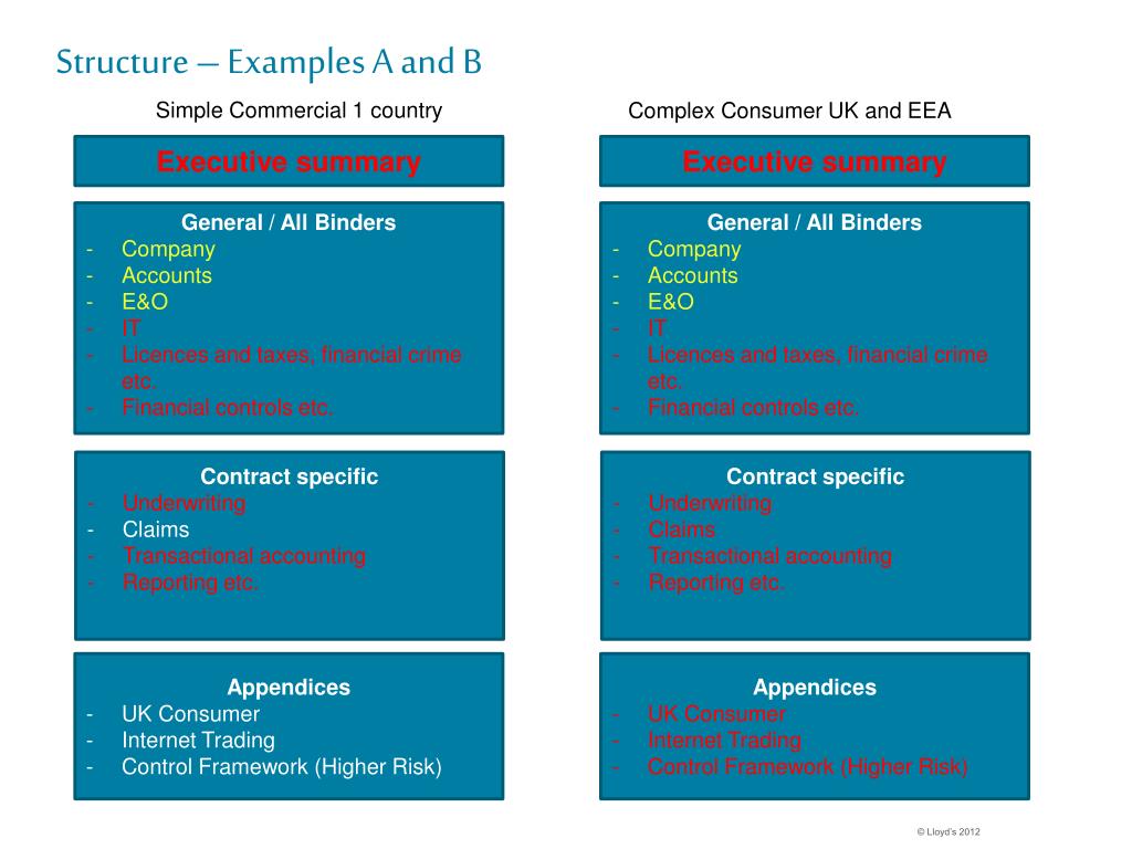 Structure – Examples A and B Simple Commercial 1 country Complex Consumer UK and EEA Executive summary Executive summary • General / All Binders • Company • Accounts • E&O • IT • Licences and taxes, financial crime etc. • Financial controls etc. • General / All Binders • Company • Accounts • E&O • IT • Licences and taxes, financial crime etc. • Financial controls etc. • Contract specific • Underwriting • Claims • Transactional accounting • Reporting etc. • Contract specific • Underwriting • Claims • Transactional accounting • Reporting etc. • Appendices • UK Consumer • Internet Trading • Control Framework (Higher Risk) • Appendices • UK Consumer • Internet Trading • Control Framework (Higher Risk)