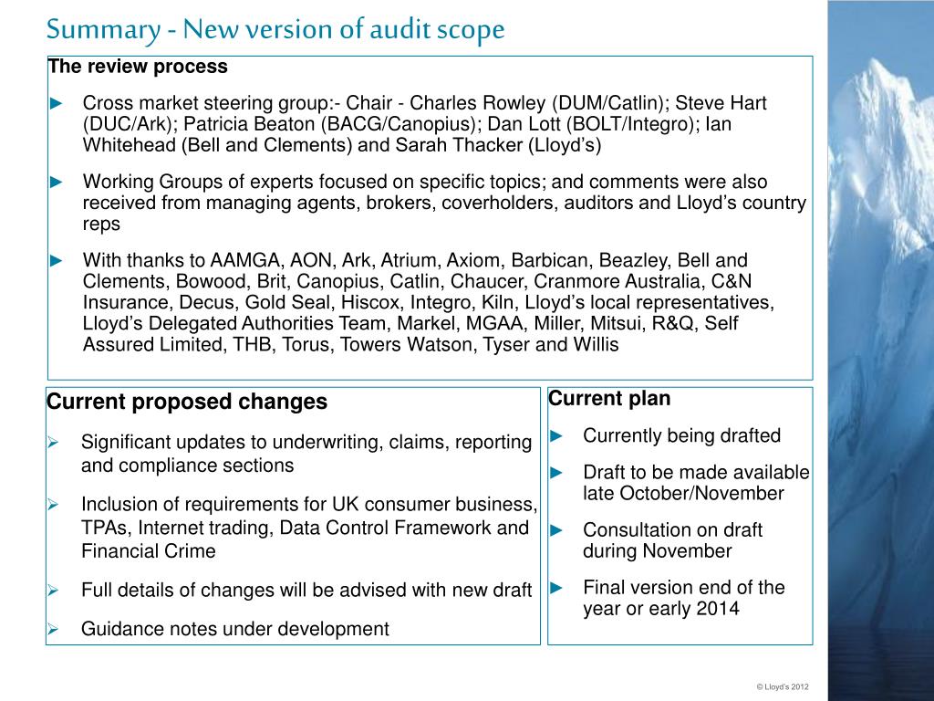 Summary - New version of audit scope Current proposed changes • Significant updates to underwriting, claims, reporting and compliance sections • Inclusion of requirements for UK consumer business, TPAs, Internet trading, Data Control Framework and Financial Crime • Full details of changes will be advised with new draft • Guidance notes under development Current plan • Currently being drafted • Draft to be made available late October/November • Consultation on draft during November • Final version end of the year or early 2014 The review process • Cross market steering group:- Chair - Charles Rowley (DUM/Catlin); Steve Hart (DUC/Ark); Patricia Beaton (BACG/Canopius); Dan Lott (BOLT/Integro); Ian Whitehead (Bell and Clements) and Sarah Thacker (Lloyd’s) • Working Groups of experts focused on specific topics; and comments were also received from managing agents, brokers, coverholders, auditors and Lloyd’s country reps • With thanks to AAMGA, AON, Ark, Atrium, Axiom, Barbican, Beazley, Bell and Clements, Bowood, Brit, Canopius, Catlin, Chaucer, Cranmore Australia, C&N Insurance, Decus, Gold Seal, Hiscox, Integro, Kiln, Lloyd’s local representatives, Lloyd’s Delegated Authorities Team, Markel, MGAA, Miller, Mitsui, R&Q, Self Assured Limited, THB, Torus, Towers Watson, Tyser and Willis