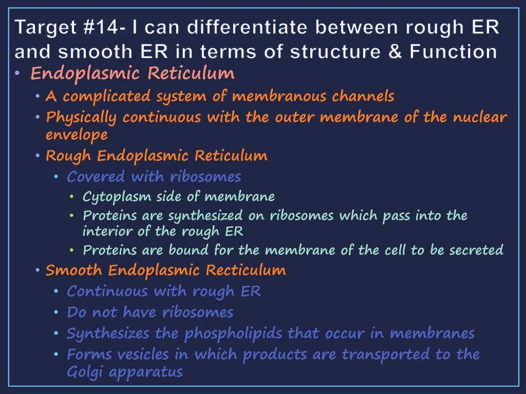 Target #14- I can differentiate between rough ER and smooth ER in terms of structure & Function • Endoplasmic Reticulum • A complicated system of membranous channels • Physically continuous with the outer membrane of the nuclear envelope • Rough Endoplasmic Reticulum • Covered with ribosomes • Cytoplasm side of membrane • Proteins are synthesized on ribosomes which pass into the interior of the rough ER • Proteins are bound for the membrane of the cell to be secreted • Smooth Endoplasmic Recticulum • Continuous with rough ER • Do not have ribosomes • Synthesizes the phospholipids that occur in membranes • Forms vesicles in which products are transported to the Golgi apparatus