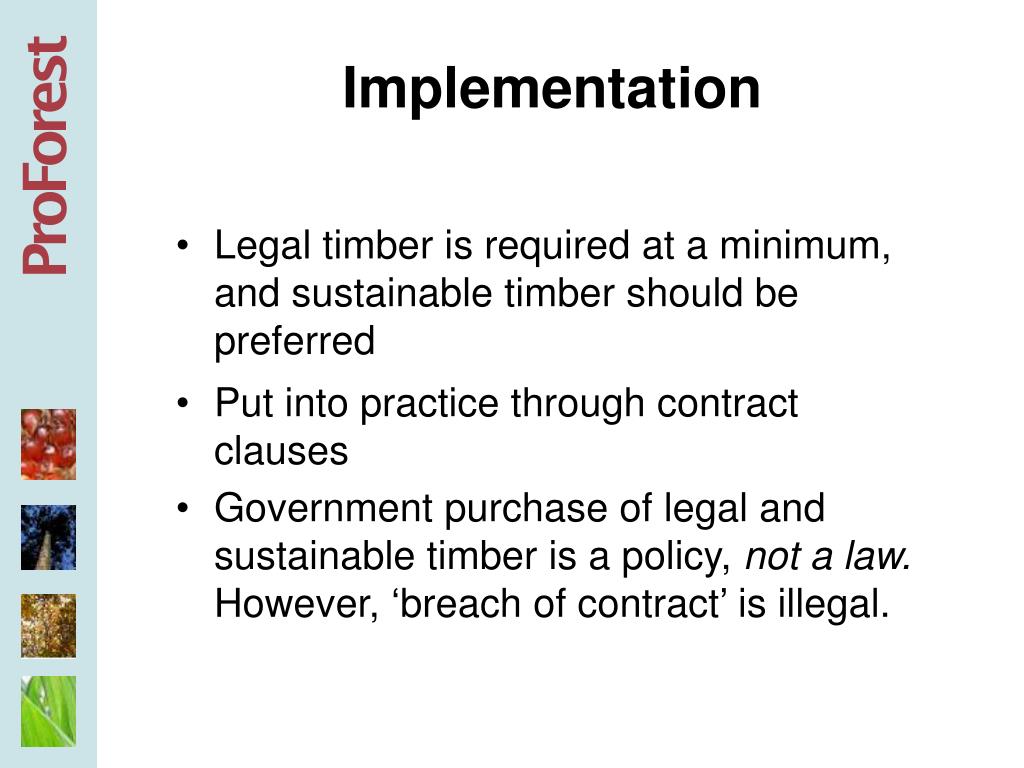 Implementation • Legal timber is required at a minimum, and sustainable timber should be preferred • Put into practice through contract clauses • Government purchase of legal and sustainable timber is a policy, not a law. However, ‘breach of contract’ is illegal.