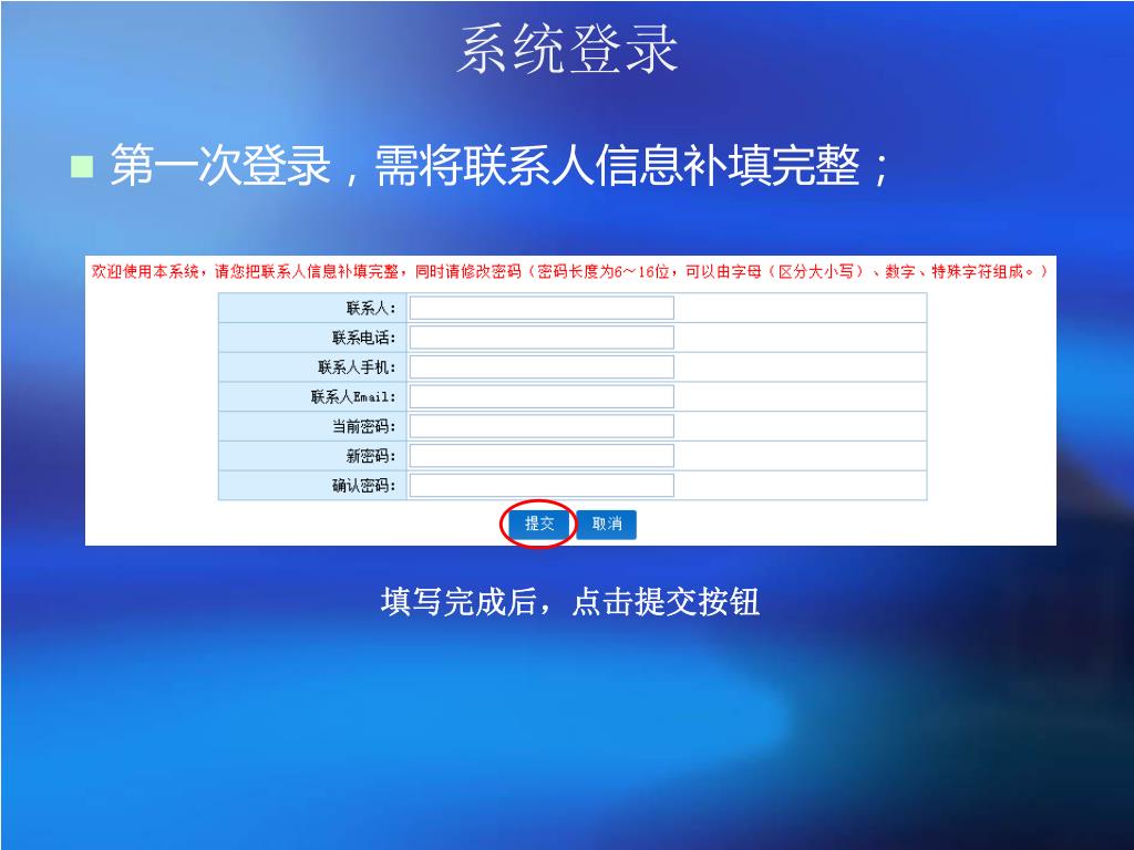 系统登录 填写完成后,点击提交按钮 • 第一次登录,需将联系人信息补填完整;