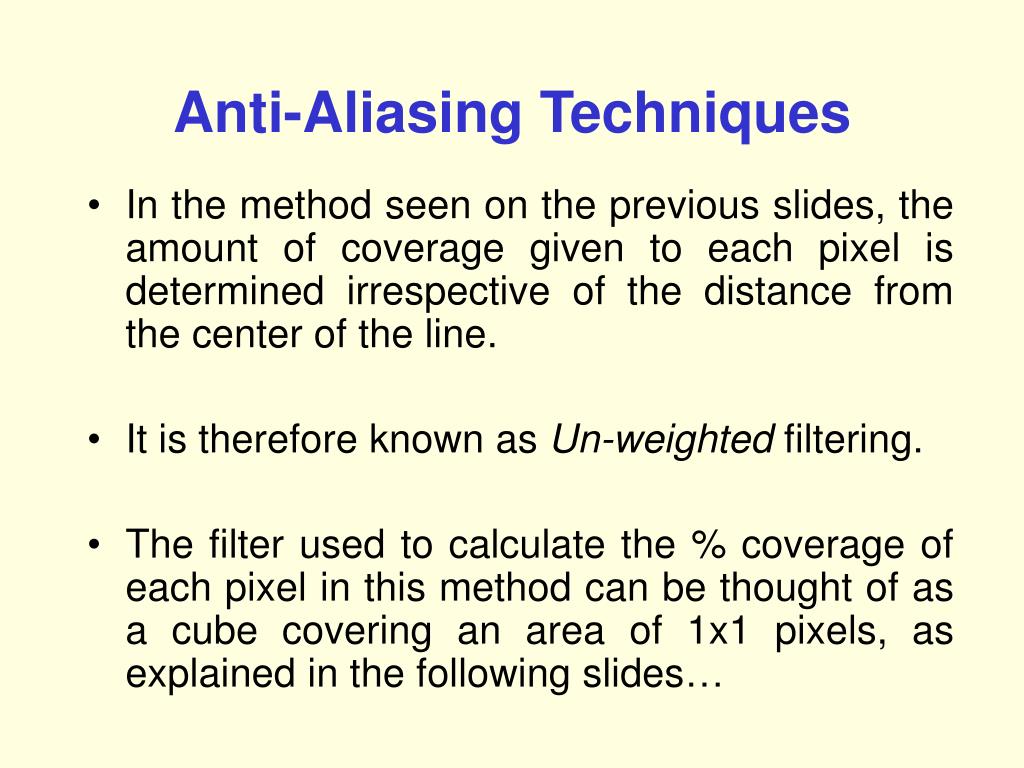 Anti-Aliasing Techniques • In the method seen on the previous slides, the amount of coverage given to each pixel is determined irrespective of the distance from the center of the line. • It is therefore known as Un-weighted filtering. • The filter used to calculate the % coverage of each pixel in this method can be thought of as a cube covering an area of 1x1 pixels, as explained in the following slides…