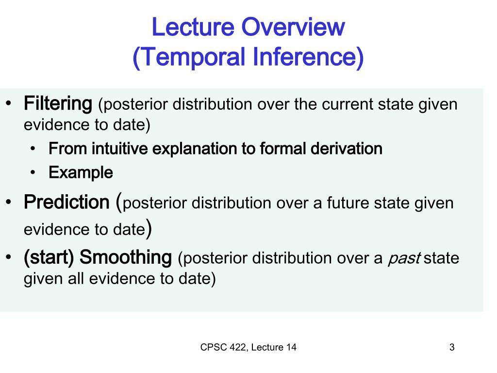 Lecture Overview • Filtering (posterior distribution over the current state given evidence to date) • From intuitive explanation to formal derivation • Example • Prediction (posterior distribution over a future state given evidence to date) • (start) Smoothing (posterior distribution over a past state given all evidence to date) CPSC 422, Lecture 14