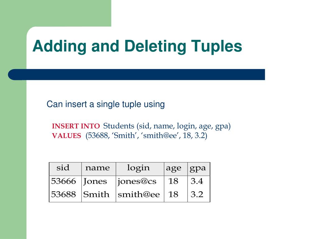 Adding and Deleting Tuples Can insert a single tuple using INSERT INTOStudents (sid, name, login, age, gpa) VALUES (53688, ‘Smith’, ‘smith@ee’, 18, 3.2)