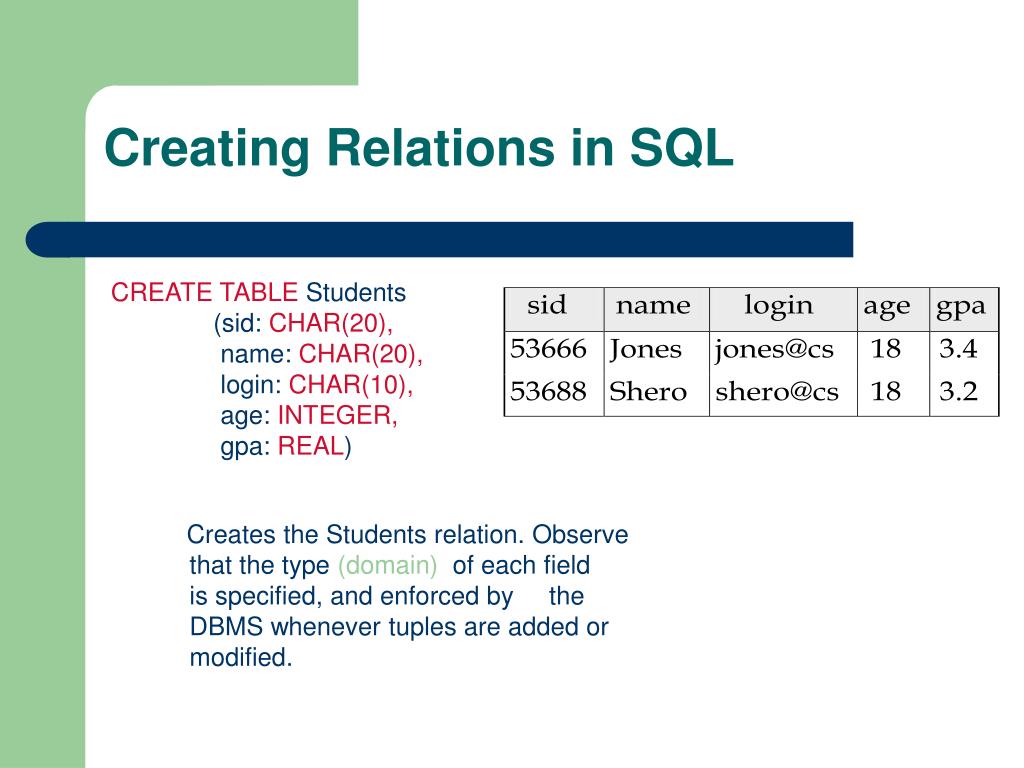 Creating Relations in SQL Creates the Students relation. Observe that the type (domain) of each field is specified, and enforced by the DBMS whenever tuples are added or modified. CREATE TABLE Students (sid: CHAR(20), name: CHAR(20), login: CHAR(10), age: INTEGER, gpa: REAL)