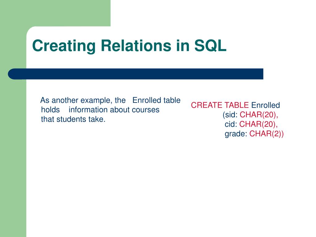 Creating Relations in SQL As another example, the Enrolled table holds information about courses that students take. CREATE TABLE Enrolled (sid: CHAR(20), cid: CHAR(20), grade: CHAR(2))