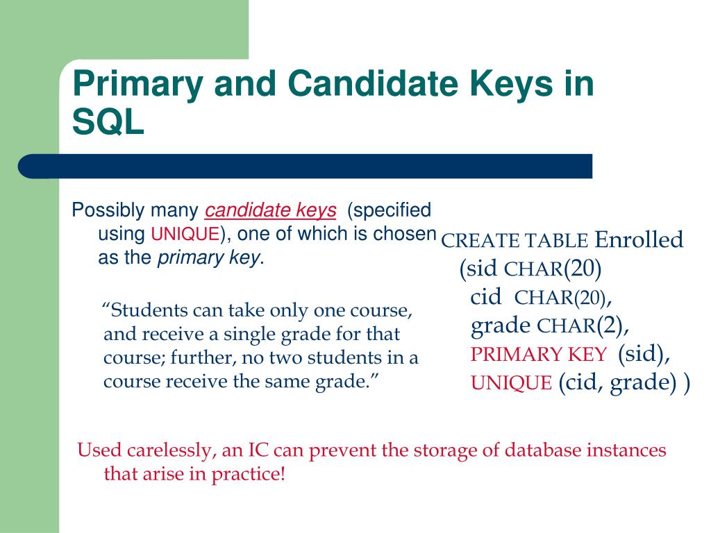Primary and Candidate Keys in SQL Possibly many candidate keys(specified using UNIQUE), one of which is chosen as the primary key. CREATE TABLE Enrolled (sid CHAR(20) cid CHAR(20), grade CHAR(2), PRIMARY KEY(sid), UNIQUE (cid, grade) ) “Students can take only one course, and receive a single grade for that course; further, no two students in a course receive the same grade.” Used carelessly, an IC can prevent the storage of database instances that arise in practice!