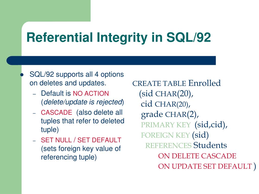 Referential Integrity in SQL/92 • SQL/92 supports all 4 options on deletes and updates. • Default is NO ACTION(delete/update is rejected) • CASCADE (also delete all tuples that refer to deleted tuple) • SET NULL / SET DEFAULT(sets foreign key value of referencing tuple) CREATE TABLE Enrolled (sid CHAR(20), cid CHAR(20), grade CHAR(2), PRIMARY KEY (sid,cid), FOREIGN KEY (sid) REFERENCESStudents ON DELETE CASCADE ON UPDATE SET DEFAULT)