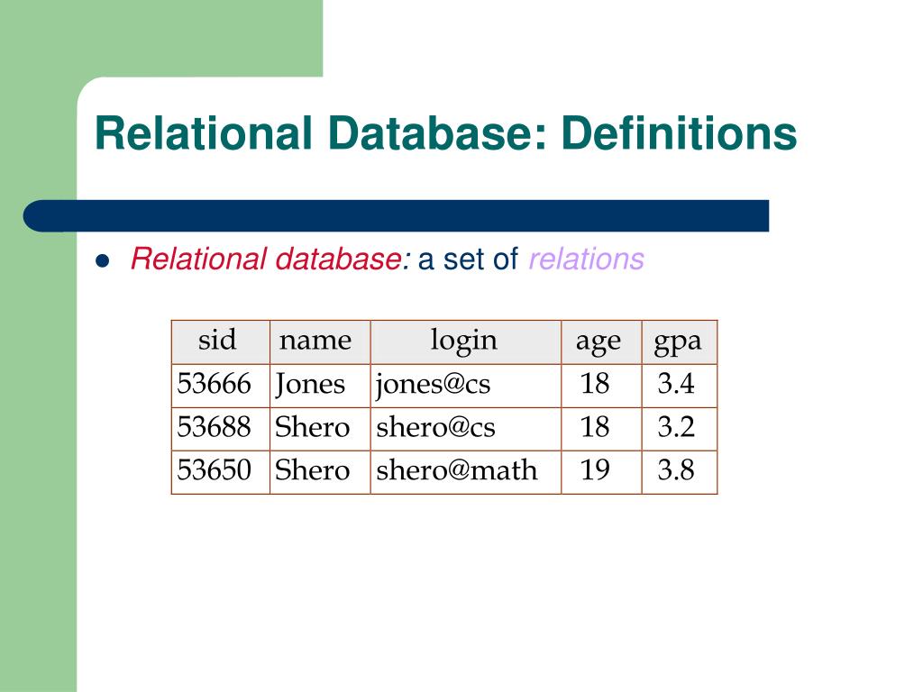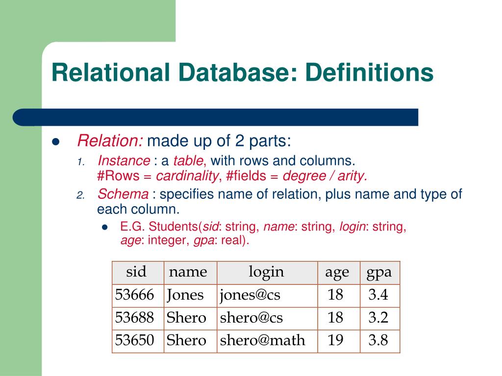 Relational Database: Definitions • Relation: made up of 2 parts: • Instance : a table, with rows and columns. #Rows = cardinality, #fields = degree / arity. • Schema :specifiesname of relation, plus name and type of each column. • E.G. Students(sid: string, name: string, login: string, age: integer, gpa: real).