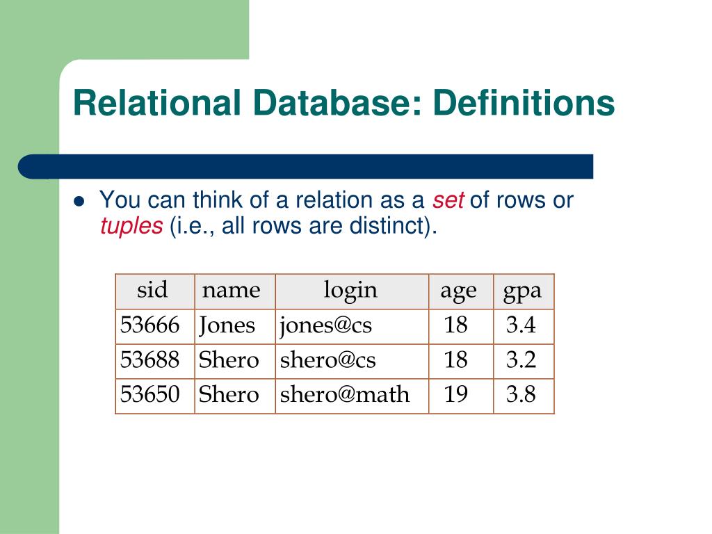 Relational Database: Definitions • You can think of a relation as a setof rows or tuples (i.e., all rows are distinct).