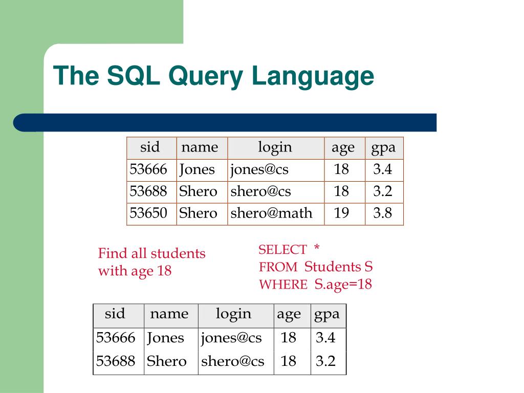 The SQL Query Language SELECT S.name, S.login FROM Students S WHERE S.age=18 Names and logins of all students with age 18