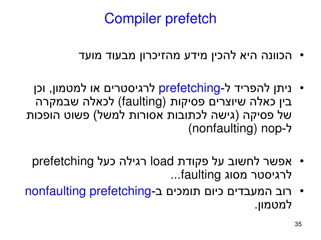 Compiler prefetch • הכוונה היא להכין מידע מהזיכרון מבעוד מועד • ניתן להפריד ל-prefetchingלרגיסטרים או למטמון, וכן בין כאלה שיוצרים פסיקות (faulting) לכאלה שבמקרה של פסיקה (גישה לכתובות אסורות למשל) פשוט הופכות ל-nop(nonfaulting) • אפשר לחשוב על פקודת load רגילה כעל prefetching לרגיסטר מסוג faulting... • רוב המעבדים כיום תומכים ב-nonfaulting prefetchingלמטמון.