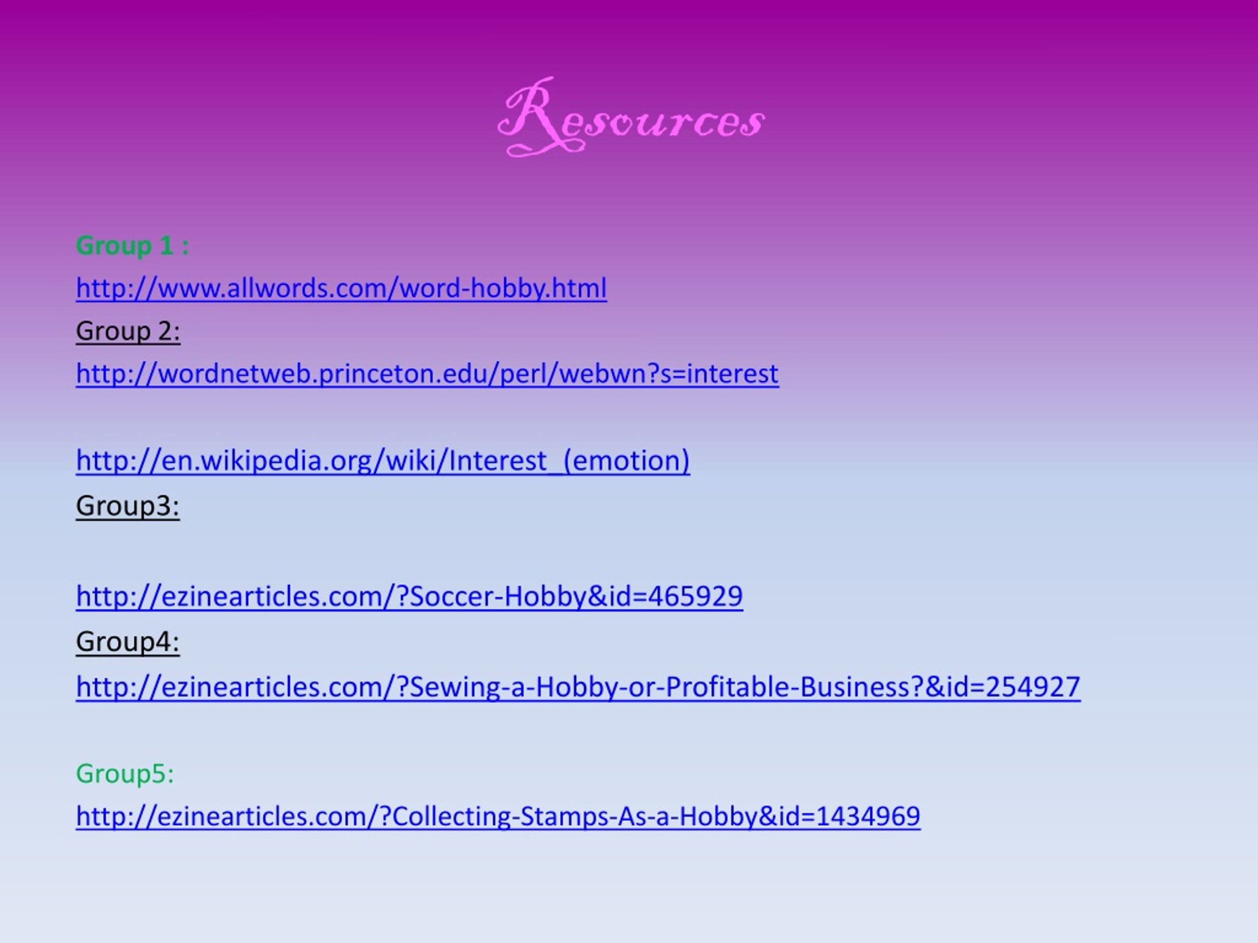 Resources Group 1 : http://www.allwords.com/word-hobby.html Group 2: http://wordnetweb.princeton.edu/perl/webwn?s=interest http://en.wikipedia.org/wiki/Interest_(emotion) Group3: http://ezinearticles.com/?Soccer-Hobby&id=465929 Group4: http://ezinearticles.com/?Sewing-a-Hobby-or-Profitable-Business?&id=254927 Group5: http://ezinearticles.com/?Collecting-Stamps-As-a-Hobby&id=1434969