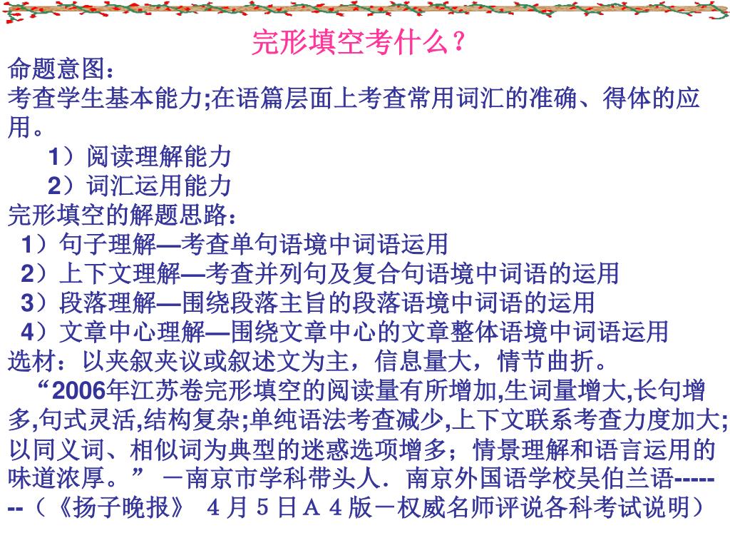完形填空考什么? 命题意图: 考查学生基本能力;在语篇层面上考查常用词汇的准确、得体的应用。 1)阅读理解能力 2)词汇运用能力 完形填空的解题思路: 1)句子理解—考查单句语境中词语运用 2)上下文理解—考查并列句及复合句语境中词语的运用 3)段落理解—围绕段落主旨的段落语境中词语的运用 4)文章中心理解—围绕文章中心的文章整体语境中词语运用 选材:以夹叙夹议或叙述文为主,信息量大,情节曲折。 “2006年江苏卷完形填空的阅读量有所增加,生词量增大,长句增多,句式灵活,结构复杂;单纯语法考查减少,上下文联系考查力度加大;以同义词、相似词为典型的迷惑选项增多;情景理解和语言运用的味道浓厚。” -南京市学科带头人.南京外国语学校吴伯兰语-------(《扬子晚报》 4月5日A4版-权威名师评说各科考试说明)