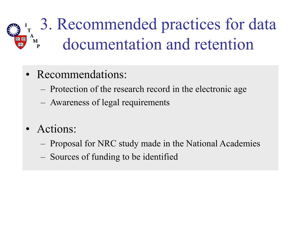 3. Recommended practices for data documentation and retention • Recommendations: • Protection of the research record in the electronic age • Awareness of legal requirements • Actions: • Proposal for NRC study made in the National Academies • Sources of funding to be identified