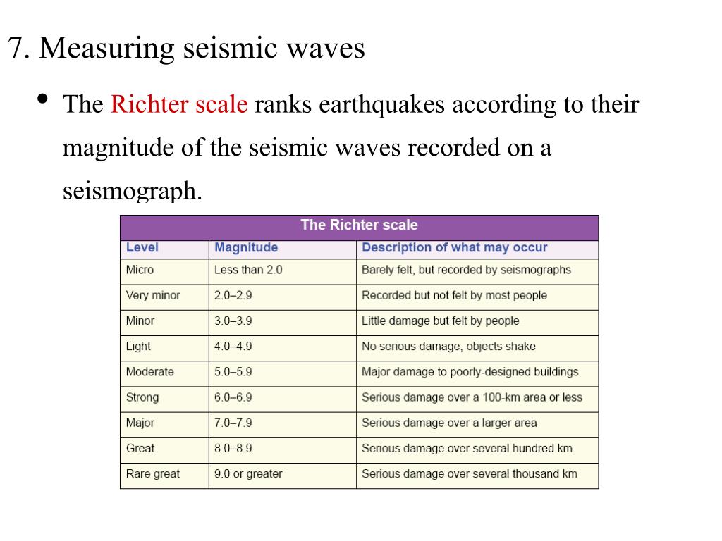 7. Measuring seismic waves • The Richter scaleranks earthquakes according to their magnitude of the seismic waves recorded on a seismograph.