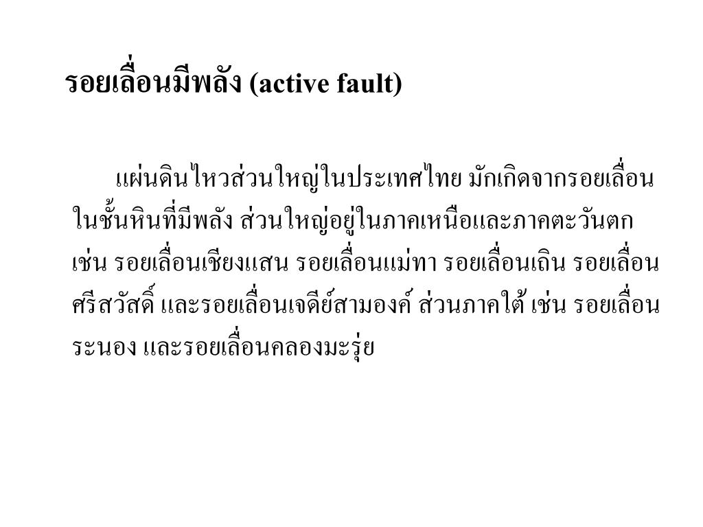 รอยเลื่อนมีพลัง (active fault) แผ่นดินไหวส่วนใหญ่ในประเทศไทย มักเกิดจากรอยเลื่อนในชั้นหินที่มีพลัง ส่วนใหญ่อยู่ในภาคเหนือและภาคตะวันตก เช่น รอยเลื่อนเชียงแสน รอยเลื่อนแม่ทา รอยเลื่อนเถิน รอยเลื่อนศรีสวัสดิ์ และรอยเลื่อนเจดีย์สามองค์ ส่วนภาคใต้ เช่น รอยเลื่อนระนอง และรอยเลื่อนคลองมะรุ่ย