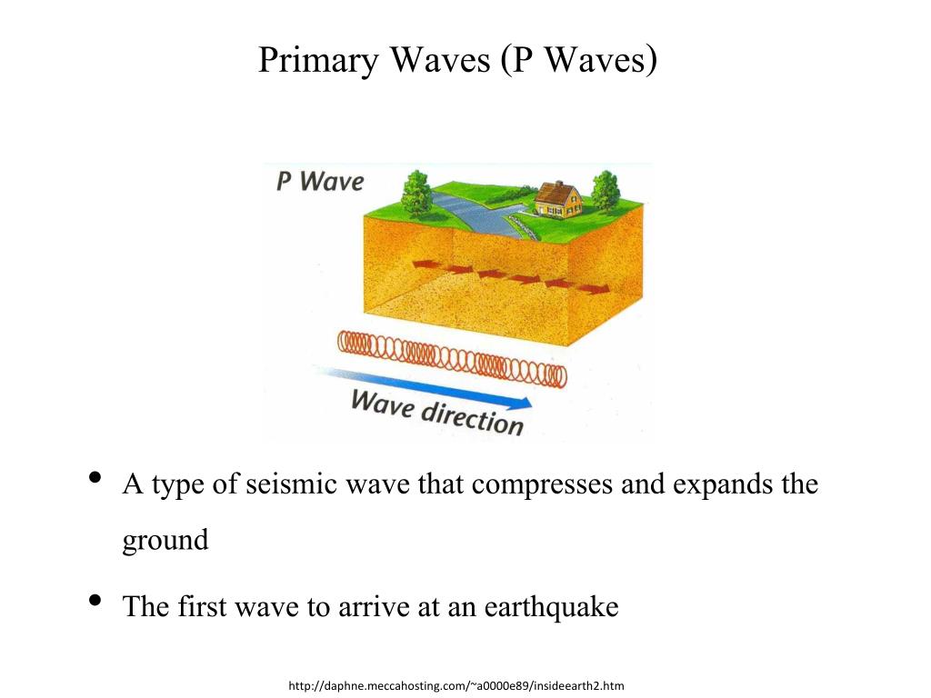 Primary Waves (P Waves) • A type of seismic wave that compresses and expands the ground • The first wave to arrive at an earthquake http://daphne.meccahosting.com/~a0000e89/insideearth2.htm