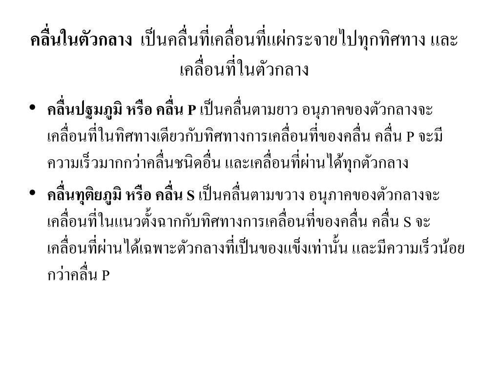คลื่นในตัวกลาง เป็นคลื่นที่เคลื่อนที่แผ่กระจายไปทุกทิศทาง และเคลื่อนที่ในตัวกลาง • คลื่นปฐมภูมิ หรือ คลื่น P เป็นคลื่นตามยาว อนุภาคของตัวกลางจะเคลื่อนที่ในทิศทางเดียวกับทิศทางการเคลื่อนที่ของคลื่น คลื่น P จะมีความเร็วมากกว่าคลื่นชนิดอื่น และเคลื่อนที่ผ่านได้ทุกตัวกลาง • คลื่นทุติยภูมิ หรือ คลื่น S เป็นคลื่นตามขวาง อนุภาคของตัวกลางจะเคลื่อนที่ในแนวตั้งฉากกับทิศทางการเคลื่อนที่ของคลื่น คลื่น S จะเคลื่อนที่ผ่านได้เฉพาะตัวกลางที่เป็นของแข็งเท่านั้น และมีความเร็วน้อยกว่าคลื่น P