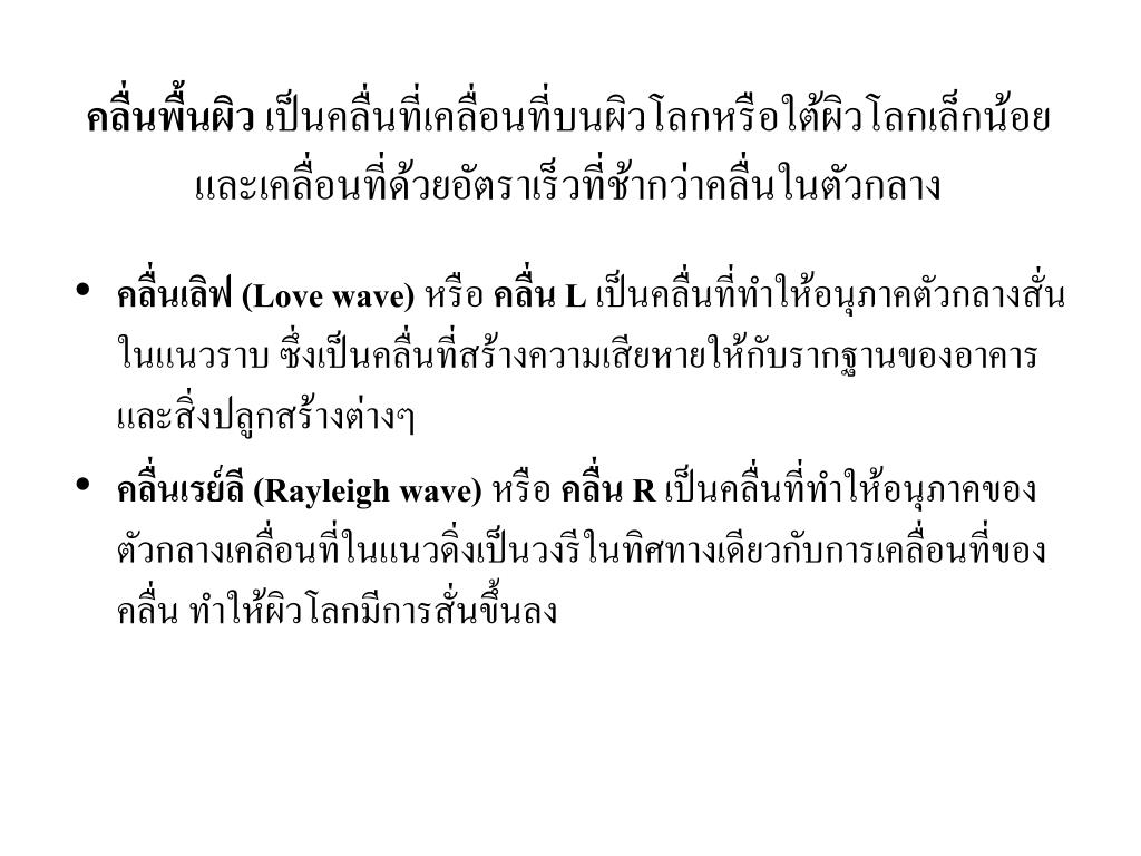 คลื่นพื้นผิว เป็นคลื่นที่เคลื่อนที่บนผิวโลกหรือใต้ผิวโลกเล็กน้อย และเคลื่อนที่ด้วยอัตราเร็วที่ช้ากว่าคลื่นในตัวกลาง • คลื่นเลิฟ (Love wave) หรือ คลื่น L เป็นคลื่นที่ทำให้อนุภาคตัวกลางสั่นในแนวราบ ซึ่งเป็นคลื่นที่สร้างความเสียหายให้กับรากฐานของอาคารและสิ่งปลูกสร้างต่างๆ • คลื่นเรย์ลี (Rayleigh wave) หรือ คลื่น R เป็นคลื่นที่ทำให้อนุภาคของตัวกลางเคลื่อนที่ในแนวดิ่งเป็นวงรีในทิศทางเดียวกับการเคลื่อนที่ของคลื่น ทำให้ผิวโลกมีการสั่นขึ้นลง