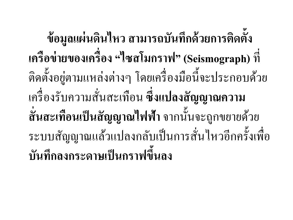 ข้อมูลแผ่นดินไหว สามารถบันทึกด้วยการติดตั้งเครือข่ายของเครื่อง “ไซสโมกราฟ” (Seismograph) ที่ติดตั้งอยู่ตามแหล่งต่างๆ โดยเครื่องมือนี้จะประกอบด้วยเครื่องรับความสั่นสะเทือน ซึ่งแปลงสัญญาณความสั่นสะเทือนเป็นสัญญาณไฟฟ้า จากนั้นจะถูกขยายด้วยระบบสัญญาณแล้วแปลงกลับเป็นการสั่นไหวอีกครั้งเพื่อบันทึกลงกระดาษเป็นกราฟขึ้นลง