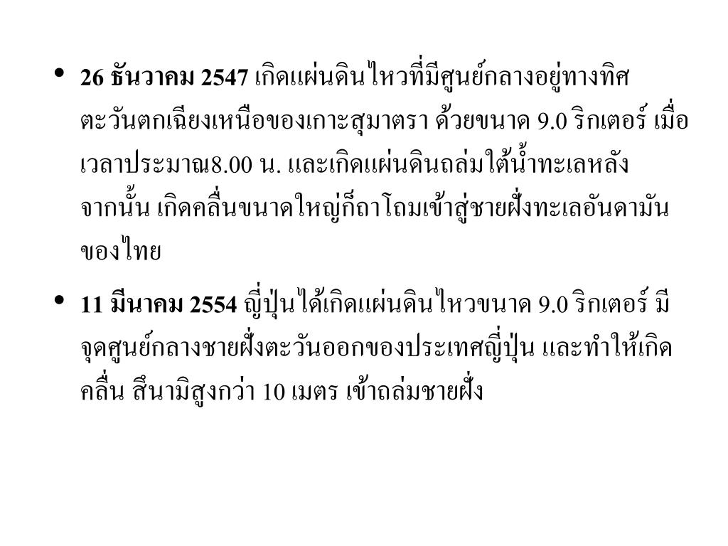 26 ธันวาคม 2547 เกิดแผ่นดินไหวที่มีศูนย์กลางอยู่ทางทิศตะวันตกเฉียงเหนือของเกาะสุมาตรา ด้วยขนาด 9.0 ริกเตอร์ เมื่อเวลาประมาณ8.00 น. และเกิดแผ่นดินถล่มใต้น้ำทะเลหลังจากนั้น เกิดคลื่นขนาดใหญ่ก็ถาโถมเข้าสู่ชายฝั่งทะเลอันดามันของไทย • 11 มีนาคม 2554 ญี่ปุ่นได้เกิดแผ่นดินไหวขนาด 9.0 ริกเตอร์ มีจุดศูนย์กลางชายฝั่งตะวันออกของประเทศญี่ปุ่น และทำให้เกิดคลื่น สึนามิสูงกว่า 10 เมตร เข้าถล่มชายฝั่ง