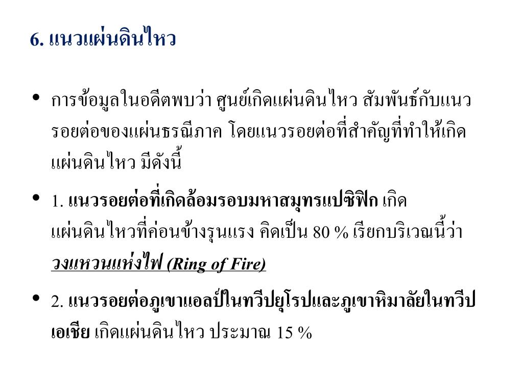 6. แนวแผ่นดินไหว • การข้อมูลในอดีตพบว่า ศูนย์เกิดแผ่นดินไหว สัมพันธ์กับแนวรอยต่อของแผ่นธรณีภาค โดยแนวรอยต่อที่สำคัญที่ทำให้เกิดแผ่นดินไหว มีดังนี้ • 1. แนวรอยต่อที่เกิดล้อมรอบมหาสมุทรแปซิฟิก เกิดแผ่นดินไหวที่ค่อนข้างรุนแรง คิดเป็น 80 % เรียกบริเวณนี้ว่า วงแหวนแห่งไฟ (Ring of Fire) • 2. แนวรอยต่อภูเขาแอลป์ในทวีปยุโรปและภูเขาหิมาลัยในทวีปเอเชีย เกิดแผ่นดินไหว ประมาณ 15 %