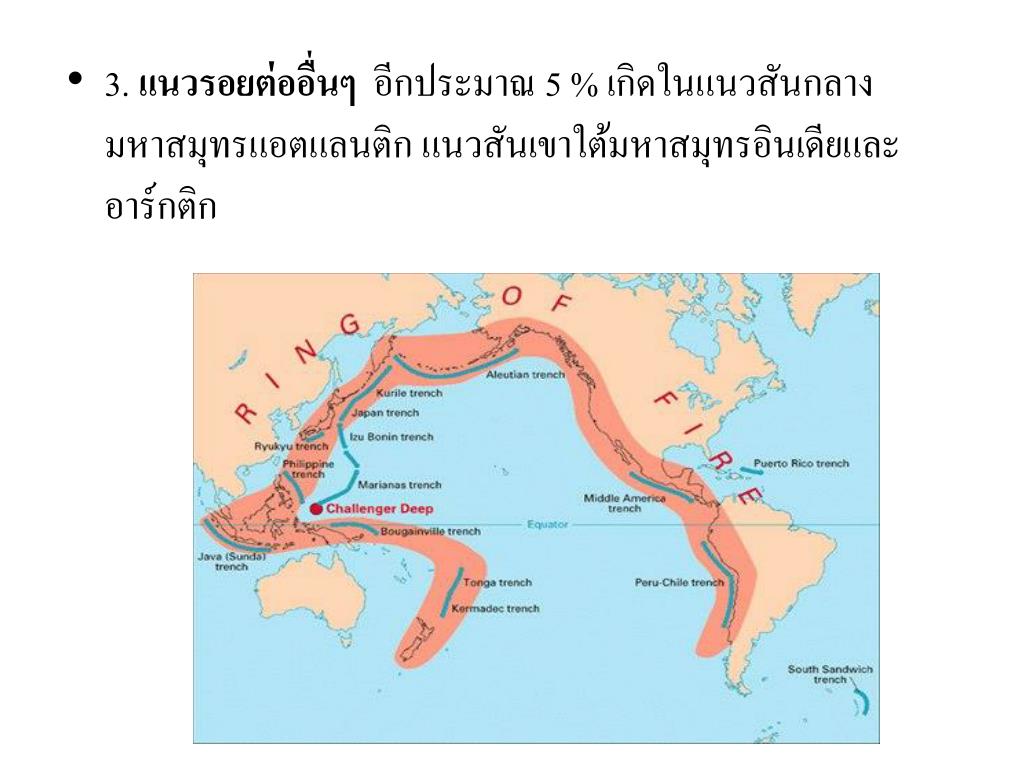 3. แนวรอยต่ออื่นๆ อีกประมาณ 5 % เกิดในแนวสันกลางมหาสมุทรแอตแลนติก แนวสันเขาใต้มหาสมุทรอินเดียและอาร์กติก