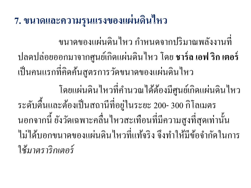 7. ขนาดและความรุนแรงของแผ่นดินไหว ขนาดของแผ่นดินไหว กำหนดจากปริมาณพลังงานที่ปลดปล่อยออกมาจากศูนย์เกิดแผ่นดินไหว โดย ชาร์ลเอฟ ริก เตอร์เป็นคนแรกที่คิดค้นสูตรการวัดขนาดของแผ่นดินไหว โดยแผ่นดินไหวที่คำนวณได้ต้องมีศูนย์เกิดแผ่นดินไหวระดับตื้นและต้องเป็นสถานีที่อยู่ในระยะ 200- 300 กิโลเมตร นอกจากนี้ ยังวัดเฉพาะคลื่นไหวสะเทือนที่มีความสูงที่สุดเท่านั้น ไม่ได้บอกขนาดของแผ่นดินไหวที่แท้จริง จึงทำให้มีข้อจำกัดในการใช้มาตราริกเตอร์