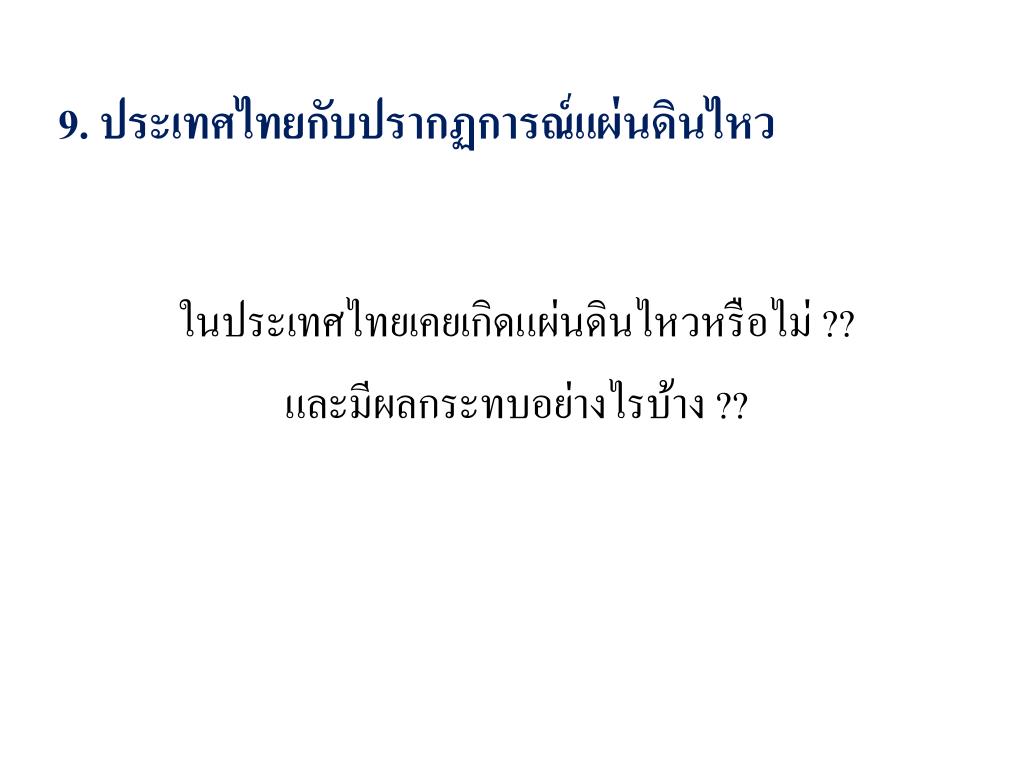 9. ประเทศไทยกับปรากฏการณ์แผ่นดินไหว ในประเทศไทยเคยเกิดแผ่นดินไหวหรือไม่ ?? และมีผลกระทบอย่างไรบ้าง ??