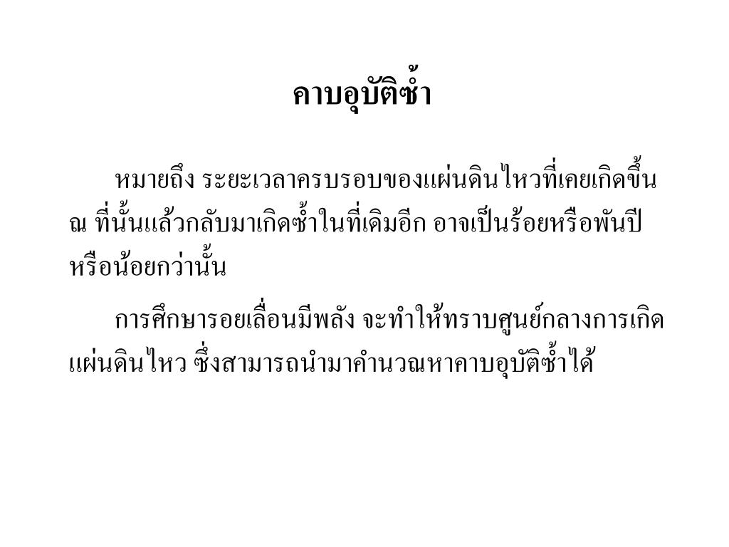 คาบอุบัติซ้ำ หมายถึง ระยะเวลาครบรอบของแผ่นดินไหวที่เคยเกิดขึ้น ณ ที่นั้นแล้วกลับมาเกิดซ้ำในที่เดิมอีก อาจเป็นร้อยหรือพันปี หรือน้อยกว่านั้น การศึกษารอยเลื่อนมีพลัง จะทำให้ทราบศูนย์กลางการเกิดแผ่นดินไหว ซึ่งสามารถนำมาคำนวณหาคาบอุบัติซ้ำได้