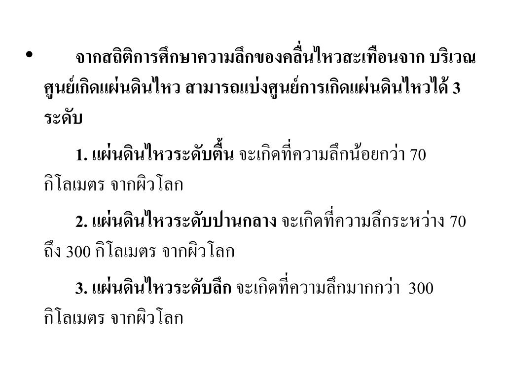 จากสถิติการศึกษาความลึกของคลื่นไหวสะเทือนจาก บริเวณศูนย์เกิดแผ่นดินไหว สามารถแบ่งศูนย์การเกิดแผ่นดินไหวได้ 3 ระดับ 1. แผ่นดินไหวระดับตื้น จะเกิดที่ความลึกน้อยกว่า 70 กิโลเมตร จากผิวโลก 2. แผ่นดินไหวระดับปานกลาง จะเกิดที่ความลึกระหว่าง 70 ถึง 300 กิโลเมตร จากผิวโลก 3. แผ่นดินไหวระดับลึก จะเกิดที่ความลึกมากกว่า 300 กิโลเมตร จากผิวโลก