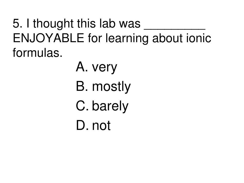 5. I thought this lab was _________ ENJOYABLE for learning about ionic formulas. • very • mostly • barely • not